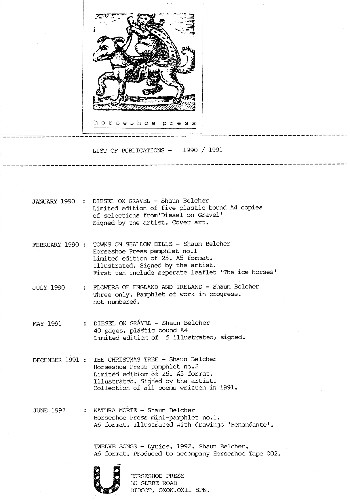 I had just completed an interesting but fruitless temporary post at The Poetry Library on the South Bank through 1990 and had my poems and songs illustrated by my sadly deceased friend Laura Stenhouse at St. Martin’s College of Art in the old building on Charing Cross Road.