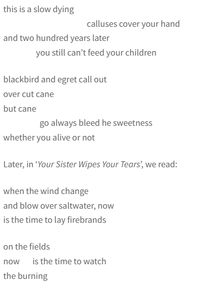The final poem of ‘Let Us Mourn The Death Of King Sugar’, titled ‘We Place Your Shroud Over You, To Wait’, conflates the death of the sugar industry itself with the innumerable human bodies destroyed in its creation, the land it formerly occupied carved up into pieces to sell off, any resurrection precluded as “concrete will get pour // into your veins, to form / traces that swell into roads // where rainstorms hold themselves back […] until one day, they burst out…”