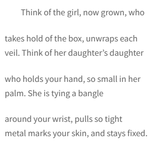 In ‘Gold’, the passing of “drop earrings, bracelets […] chain-linked anklets strung with jet beads” between generations of women, after their gifting to a newborn, comes to embody the larger histories within these small familial and communal rites: “[Her mother] knows that those who are owned // need to own something of themselves, / even if it must always stay // unseen, unworn, under the lid / of a basket. But she herself // has nothing to give except her / labour in the fields, with its glint // of cutlass against sugar cane / stalks…”