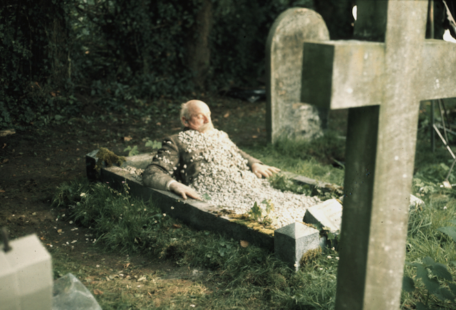 Clocking in at just 78 minutes, Requiem for a Village (1976) spends a solid ten of them conning you that it’s a documentary feature but without the expected voiceover. Static shots of a soulless ‘70s housing estate form a visually bland montage until the camera settles on a garden shed behind one of them, from which an old man wheels a pushbike. The film then tracks his journey out of the suburbs, along a bypass (lorries go rumbling past him) and into the countryside. He fetches up at a church where he tends graves. Interspersing this are shots of the natural world and some mumbled dialogue between a local landowner and a developer. Earth-moving equipment moves in on the woodland.